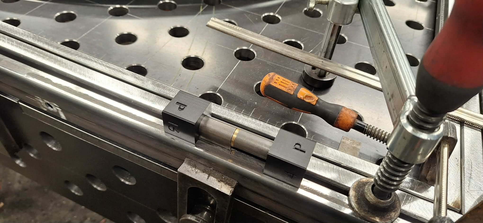 Przyrząd pasuje do zawiasów marki ELESA+GANTER GN-128-100, GN128-120 oraz im pochodnych. Narzędzie to usprawnia określenie położenia zawiasów do wspawania. Automatycznie wyznacza oś zawiasu, równoległość, odstęp od ramy i skrzydła. Dodatkowo ustala szczelinę pomiędzy ramą, a skrzydłem. Przyrząd ma możliwość regulacji tej szczeliny na poziomie 3mm,4mm i 5mm.