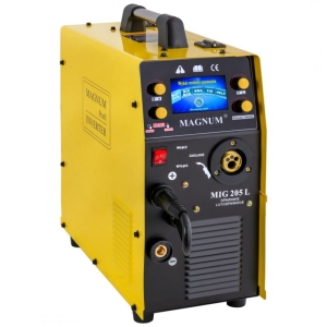 MIG 205 L firmy MAGNUM jest profesjonalnym półautomatem spawalniczym przeznaczonym do spawania stali niskowęglowej, niskostopowej (MAG), stali stopowych (MIG), aluminium i jego stopów oraz do lutospawania!!! Posiada również możliwość spawania elektrodami otulonymi (rutylowe, zasadowe, kwaśne - MMA), a także drutami samoosłonowymi (spawanie "bez gazu"). Urządzenie to znajduje zastosowanie w ciężkich warunkach produkcyjnych (przemysłowych), jak i w warsztatach naprawczych. Dzięki zastosowaniu ustawień synergicznych i czytelnego ekranu LCD, urządzenie jest
